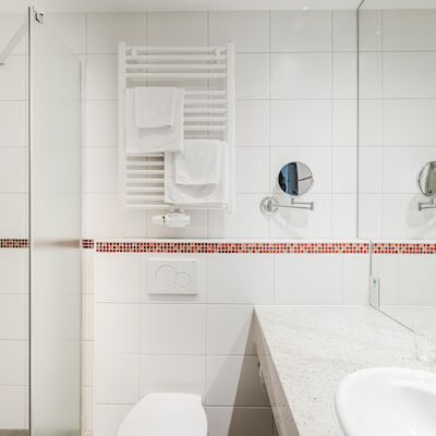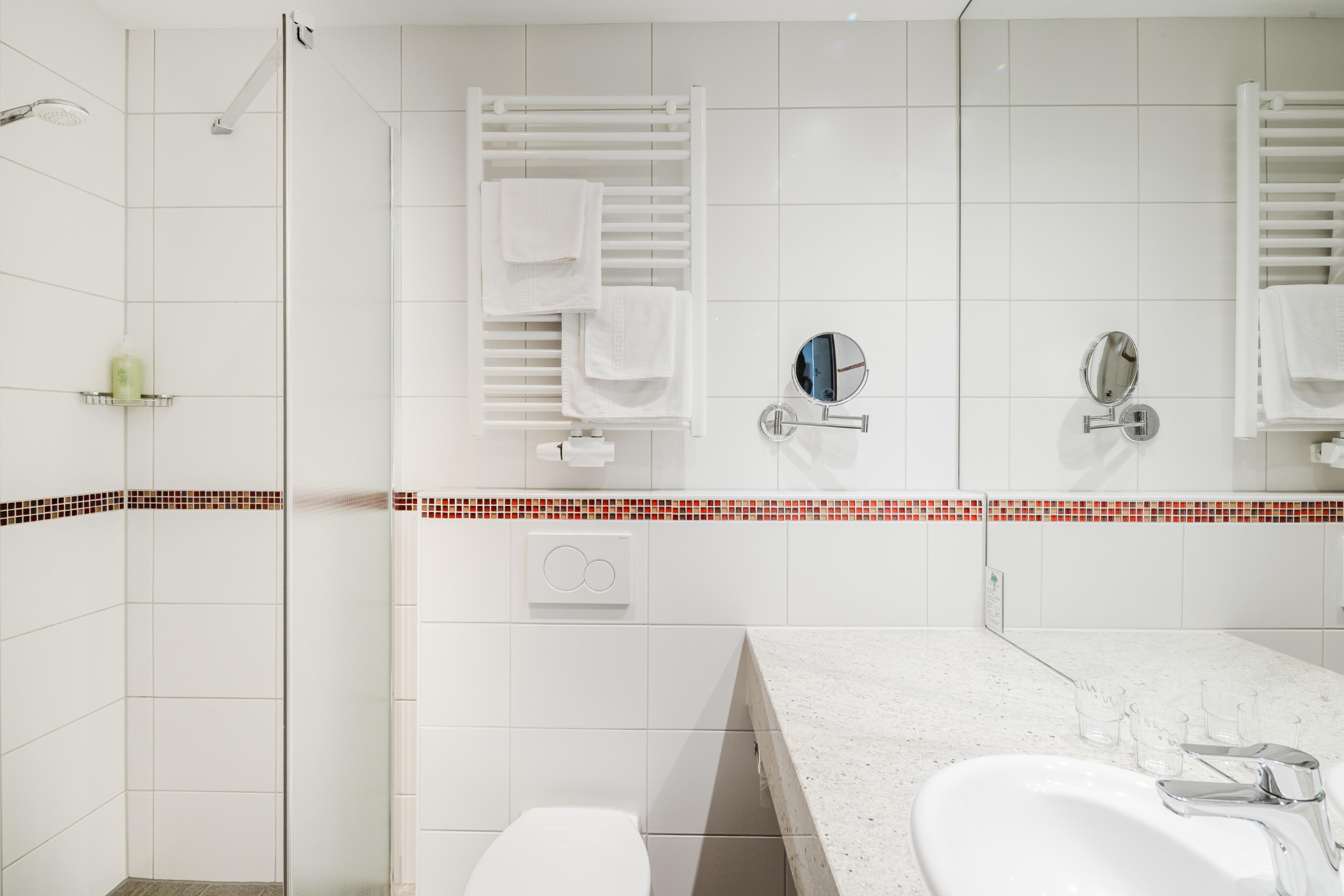 Badezimmer mit Dusche, Toilette und Handtüchern