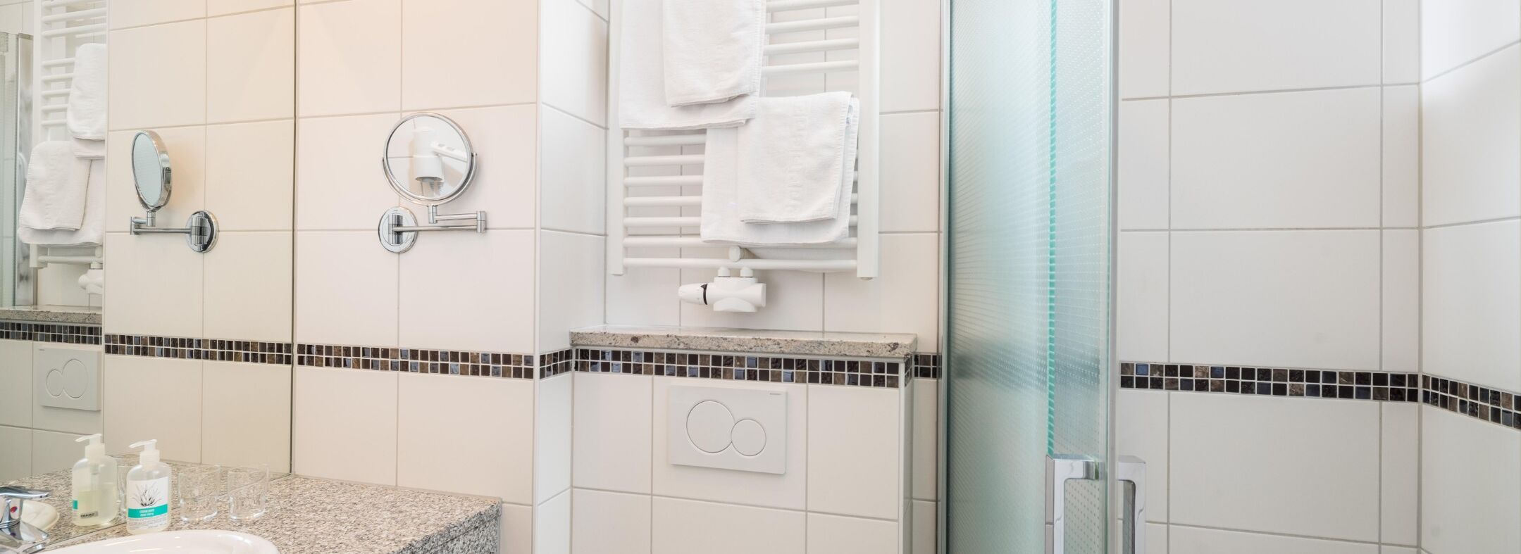 Badezimmer mit Dusche, Toilette und Handtüchern