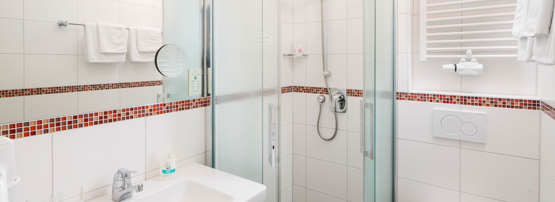 Badezimmer mit Dusche, Toilette und Handtüchern